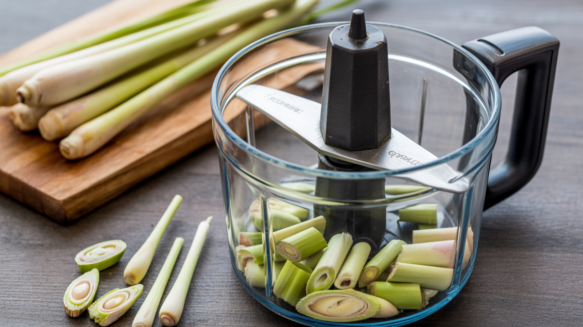 Step 1: Prepare the lemongrass: Cut off the tough roots and dry top ends of each lemongrass stalk. Peel away the outer tough layers and keep only the soft inner part of the stalk. Chop the usable portion finely. You will need enough stalks (usually about 3–4, depending on freshness and size) to obtain roughly 1¼ cups of chopped lemongrass.