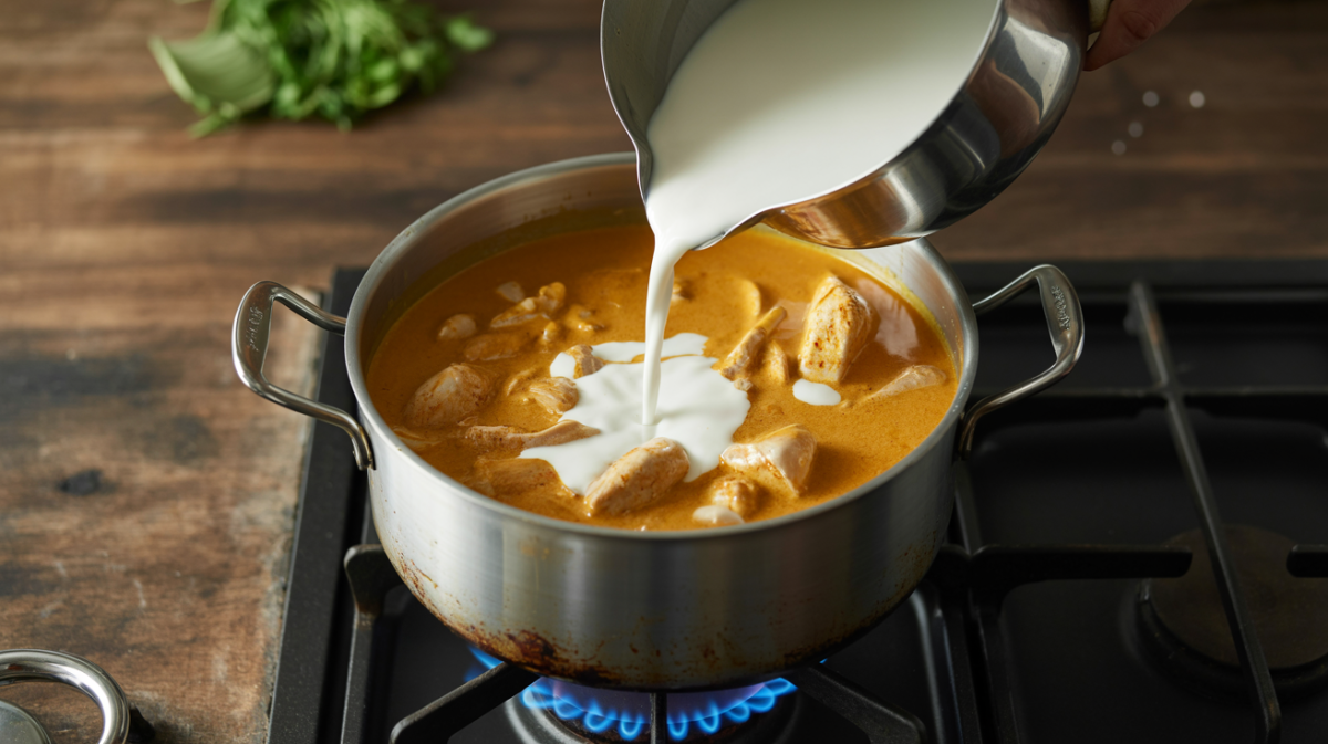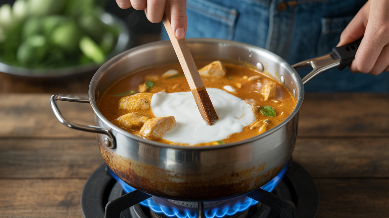 Step 4: Finish with thick coconut milk: Add the thick coconut milk and stir it in. Continue to cook for another 5 minutes, keeping the heat moderate so the coconut milk does not split. Once heated through, remove the pan from the heat.